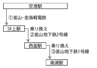 金海国際空港には「釜山-金海軽電鉄」が乗り入れており、金海国際空港駅があります。金海国際空港駅で乗車し沙上駅で地下鉄2号線に乗り換えることで西面に行くことができます。