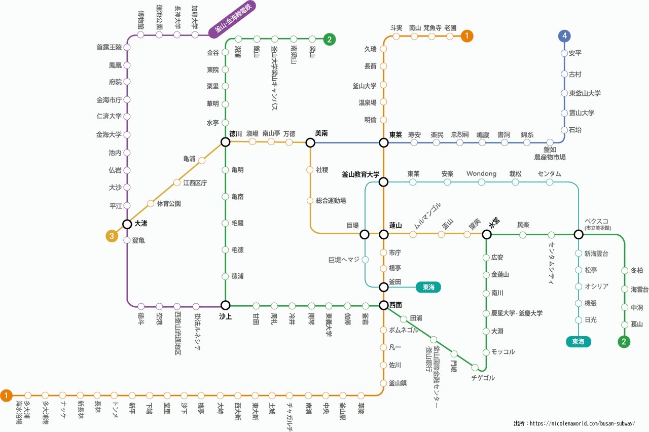 また、釜山地下鉄は、釜山交通公社が運営しており、1から4号線までの4つの路線を保有・運営しています。