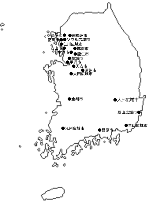 14 | 富川(プチョン)市 京畿道に属する市で、大都市に指定されています。ソウル特別市と仁川広域市に挟まれて宅地化が進んでおり、人口密度はソウルに次ぐ全国2番目となっています。近年は韓国におけるマンガ・アニメをはじめ、テレビ・映画など映像文化産業の拠点となっています。 | 76 |