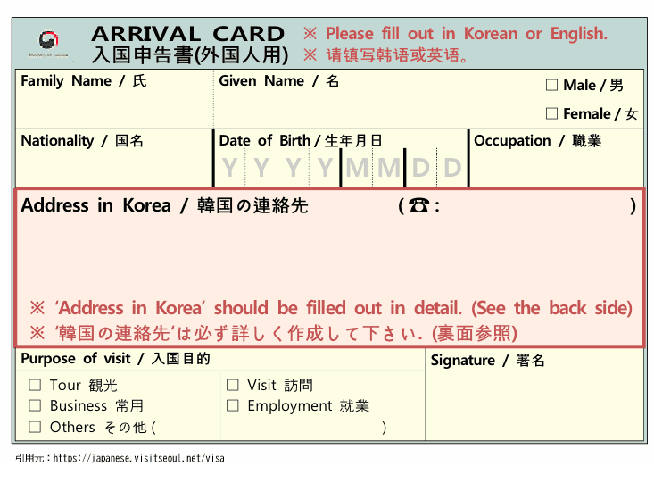 Arrival cardは機内で配布される紙での申告(英語で記入)のほかに、韓国到着3日前から行える電子入国申告(e-Arrival card)も実施されています。電子入国申告の詳細については、駐日大韓民国大使館のホームページをご確認ください。