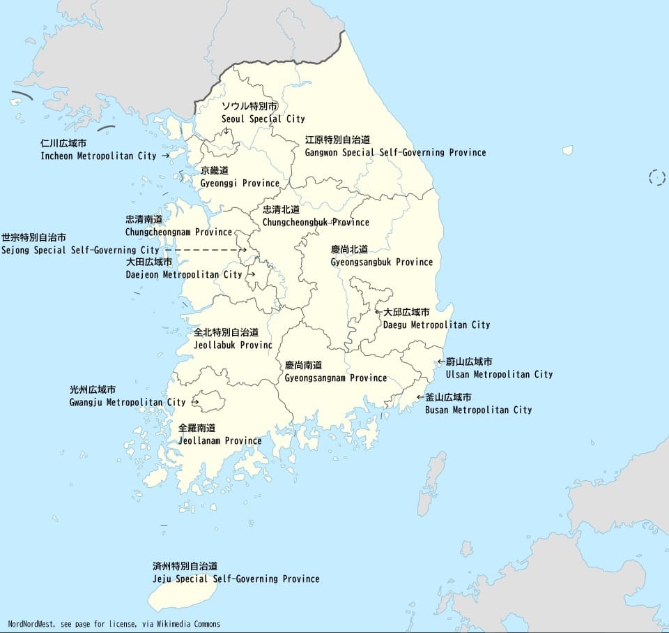 韓国の地方行政区分は、日本でいう都道府県に相当する「特別市(ソウル)」、「広域市(釜山、仁川、大邱、大田、光州、蔚山)」、「特別自治市(世宗特別自治市)」、「特別自治道(済州、江原、全北)」、「道(京畿道、忠清南道、忠清北道、全羅南道、慶尚南道、慶尚北道)」といった一級行政区と、それらに属する二級行政区「市」「郡」「区」、さらに三級行政区「邑」「面」「洞」から成り立ちます。