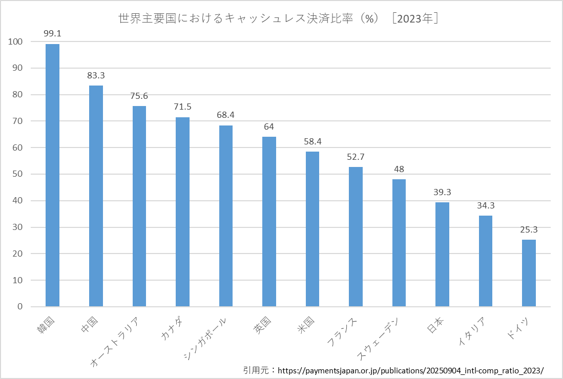 韓国は世界ナンバー1のキャッシュレス決済国で、キャッシュレス決済比率(現金以外での支払額÷民間消費支出額)は9割超と日本の4割を大きく上回っています。韓国でキャッシュレス決済が普及したのは、1997年のアジア通貨危機を乗り越えるために政府主導で行われたクレジットカード利用促進政策などによります。